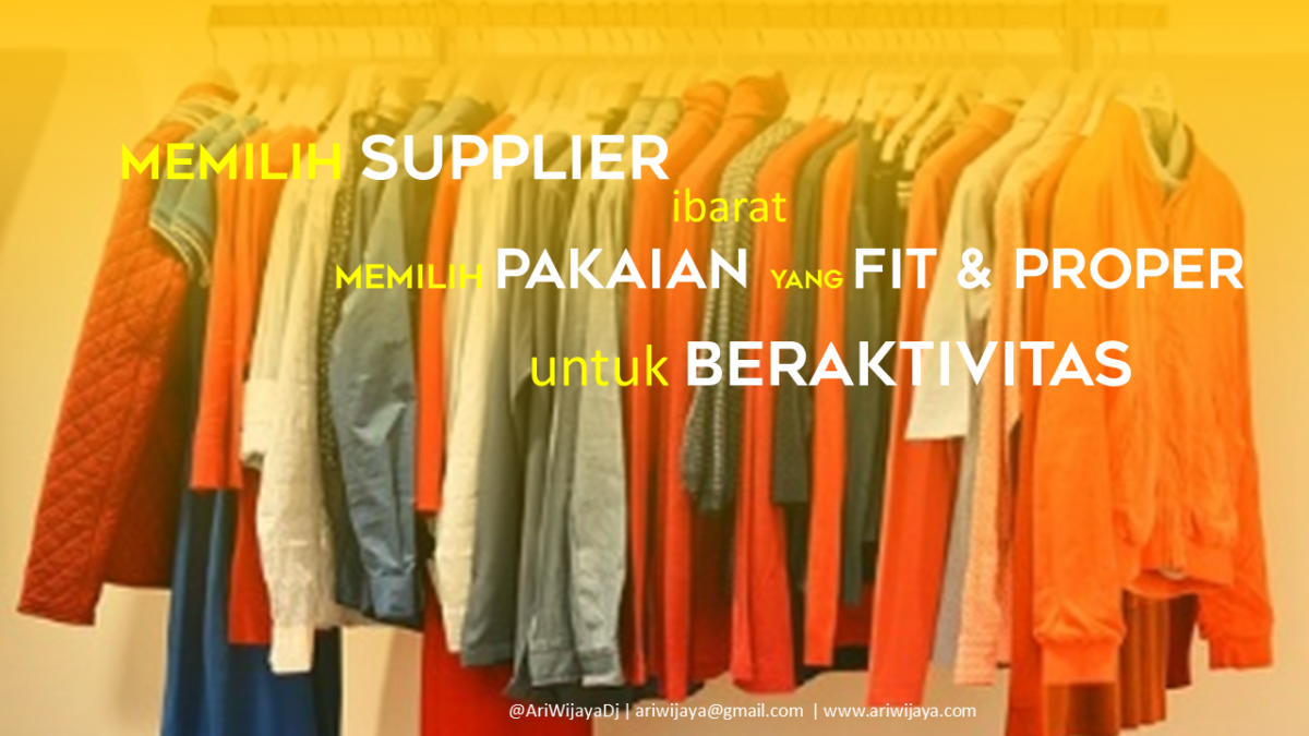 Pemilihan pemasok dapat diibaratkan memilih baju yang pas dan sesuai untuk menjalankan aktivitas. Coba dibayangkan. Pakai jaket kulit plus setelan celana yang mahal dan keren untuk olah raga. Justru buang uang, bukan ? Bisa kok hanya pakai kaos dan celana olah raga. Bahkan bisa dinilai orang norak. Parahnya, jika anda ikut kompetisi, malah dilarang masuk arena. Pakaian tidak sesuai dengan aturan pertandingan.